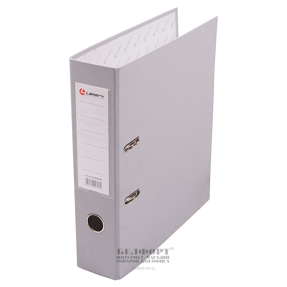 Папка-регистратор А4, арочный механизм, ширина корешка 80мм, полипропилен, серый, Lamark с карманом на корешке, внутреннее поле для записей, с метал. окантов