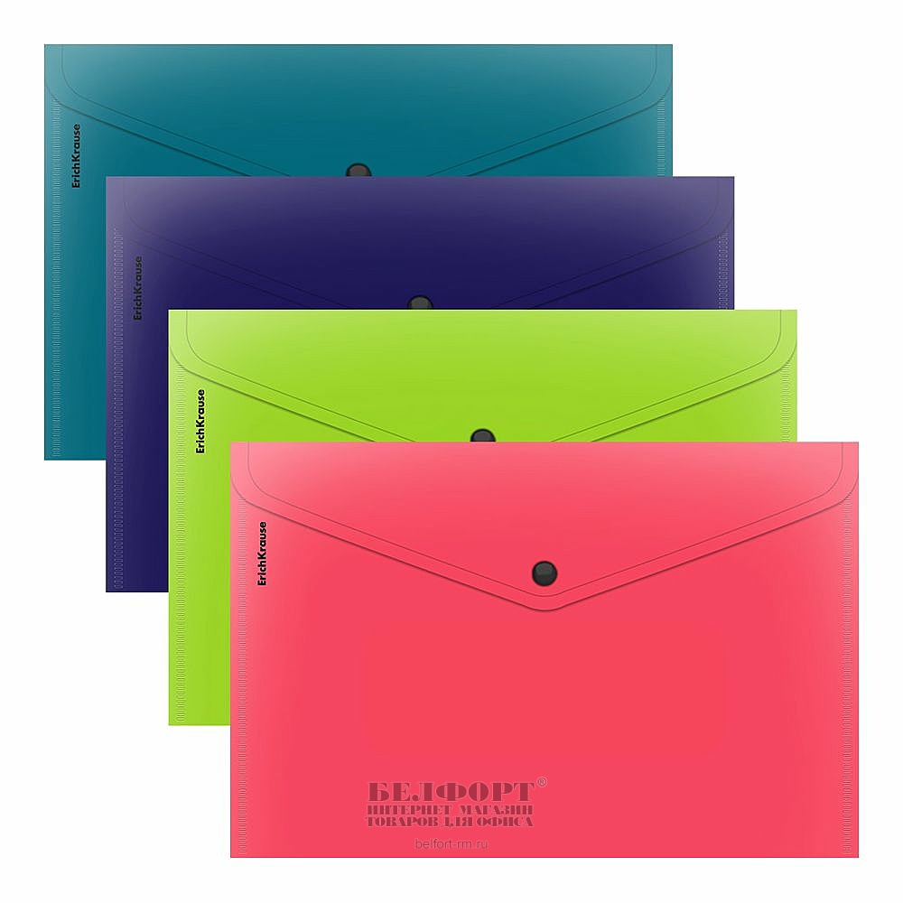 Добавить к сравнению261041Есть в наличии 21 шт.Папка-конверт на кнопке, А4, 0,18мм, Erich Krause, "Diamond Vivid", полупрозрачная, ассорти, 333мм*232мм, пластик