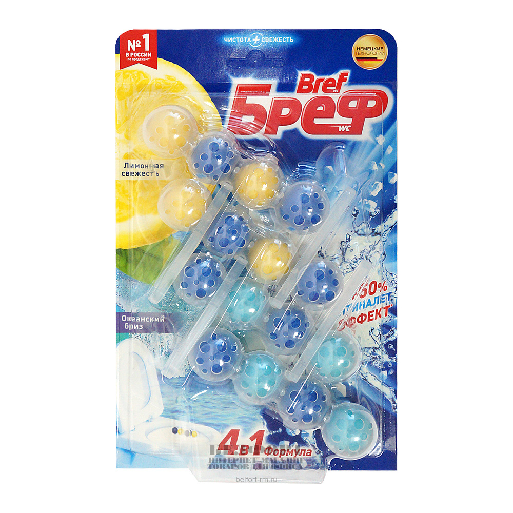 Блок гигиенический Bref, "Сила-Актив", "Лимонная свежесть и Океанский бриз", для унитаза, 4*50г, шарики