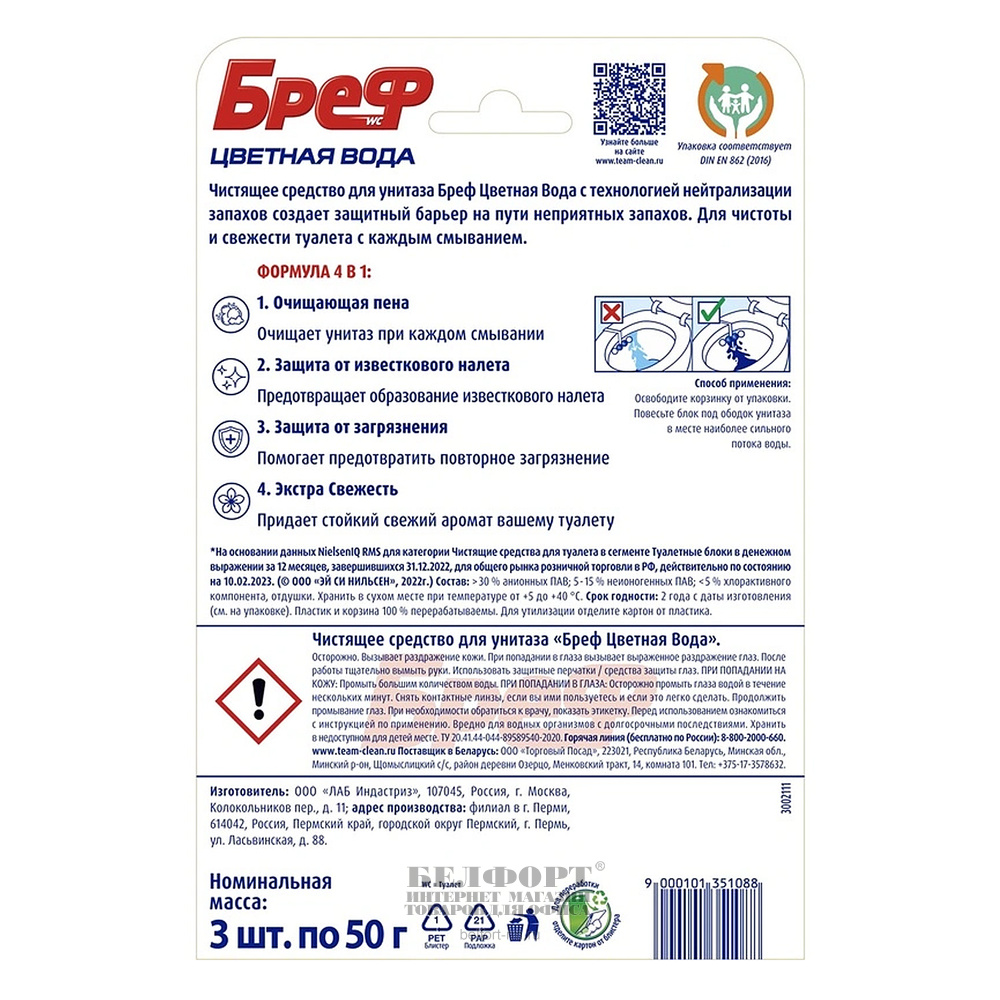 Блок гигиенический Bref, "Color Aktiv", "С хлор-компонентом", для унитаза, 3*50г, шарики