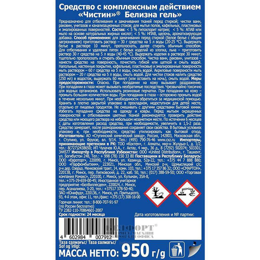 Белизна-гель Чистин, 950мл, хлор, отбеливатель, флакон