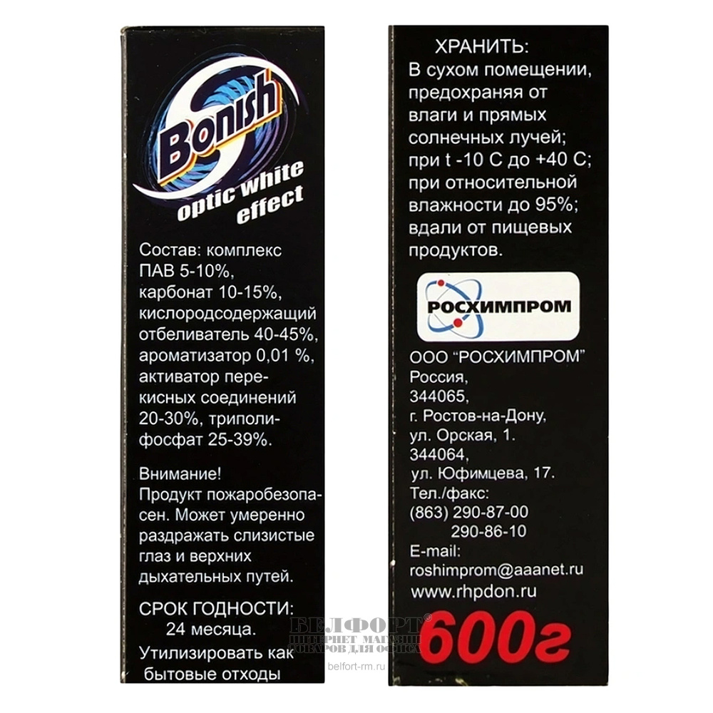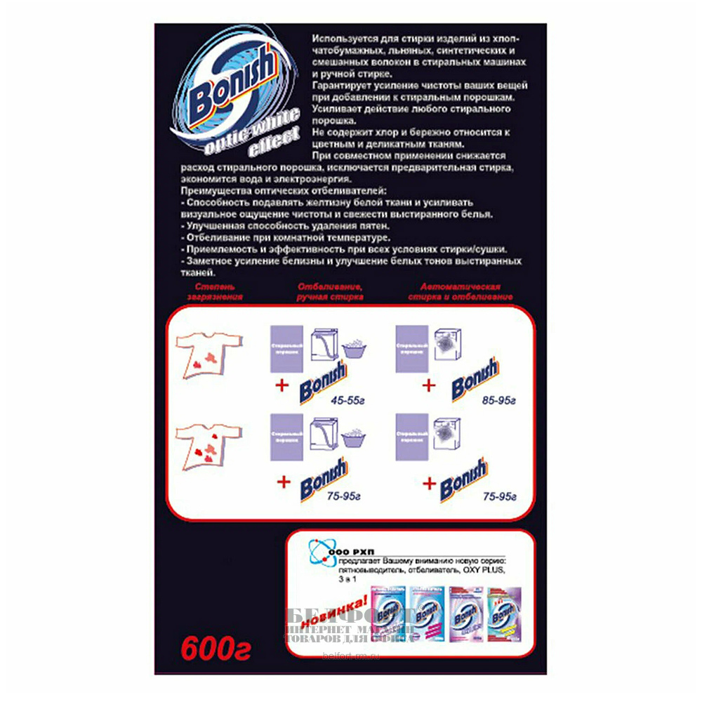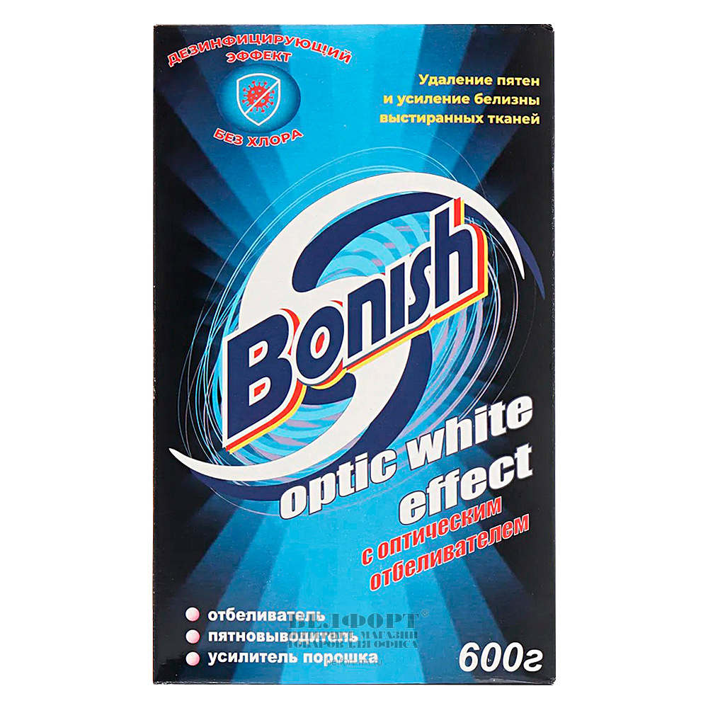 Отбеливатель Bonish, "Optic white effect", 600г, без хлора, кислородосодержащий, картон. уп.