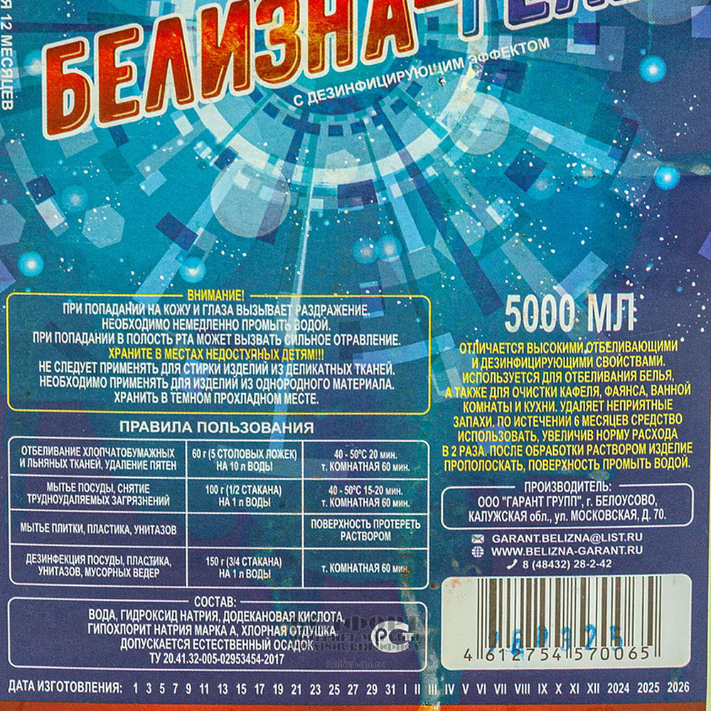 Белизна-гель Гарант, 5л, концентрат, гипохлорит натрия 28%, с дезинфицирующим эффектом, канистра