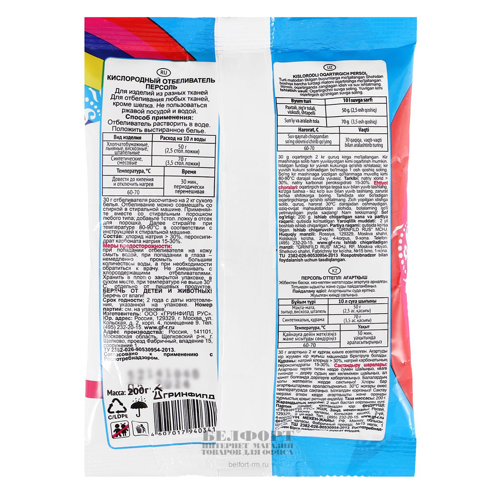 Добавить к сравнению221030Есть в наличии 51 шт.Отбеливатель Золушка, "Персоль", 250г, без хлора, кислородосодержащий, пакет