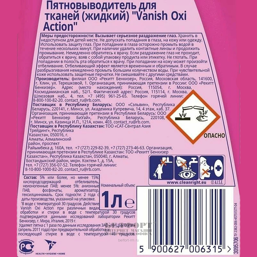 Добавить к сравнению141707Есть в наличии 1 шт.Пятновыводитель Vanish, "Oxi Action. Для белого", 1л, флакон