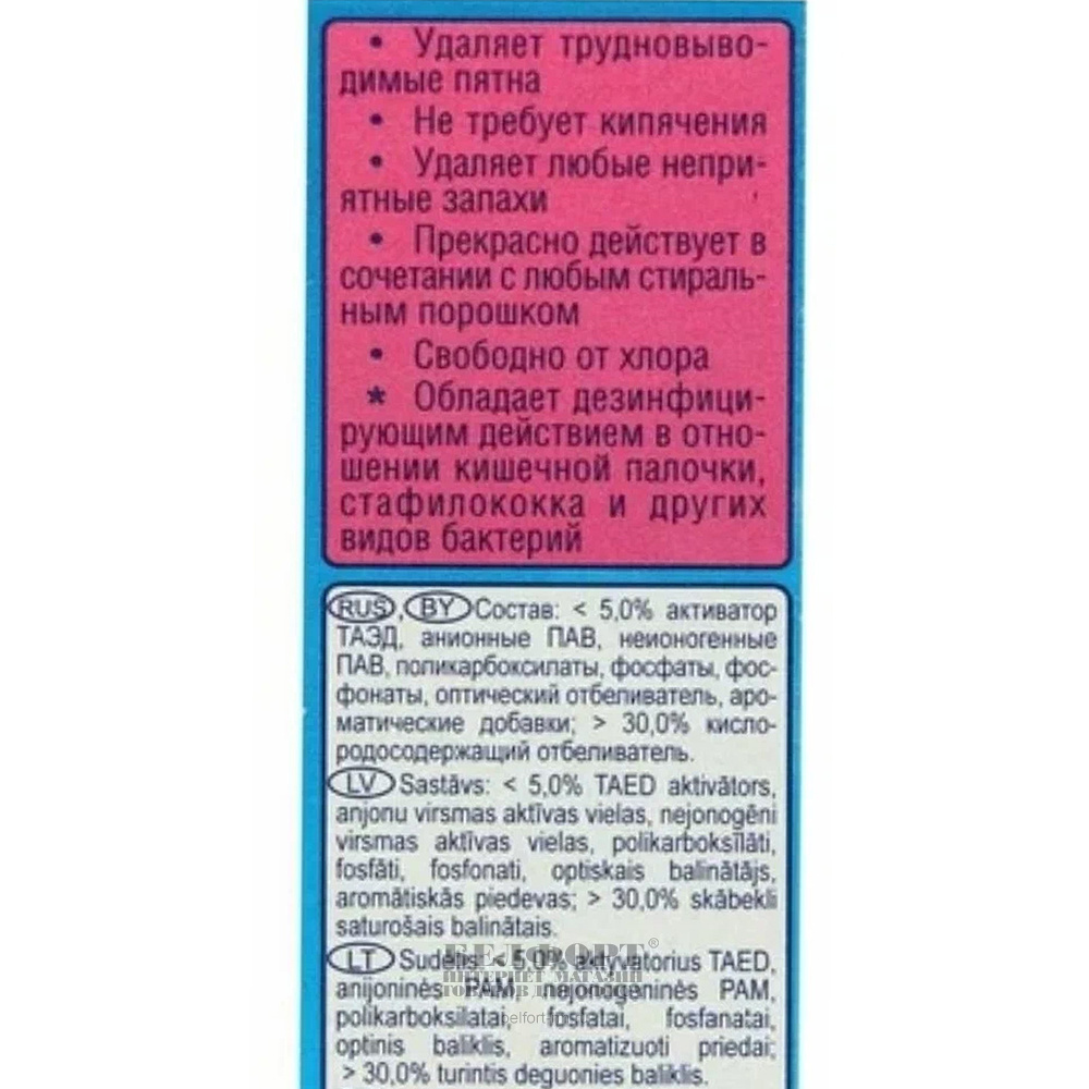 Отбеливает и дезинфицирует при пониженной температуре (30-50°С) в процессе замачивания и стирки.