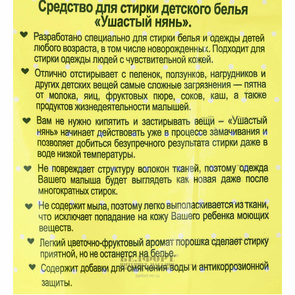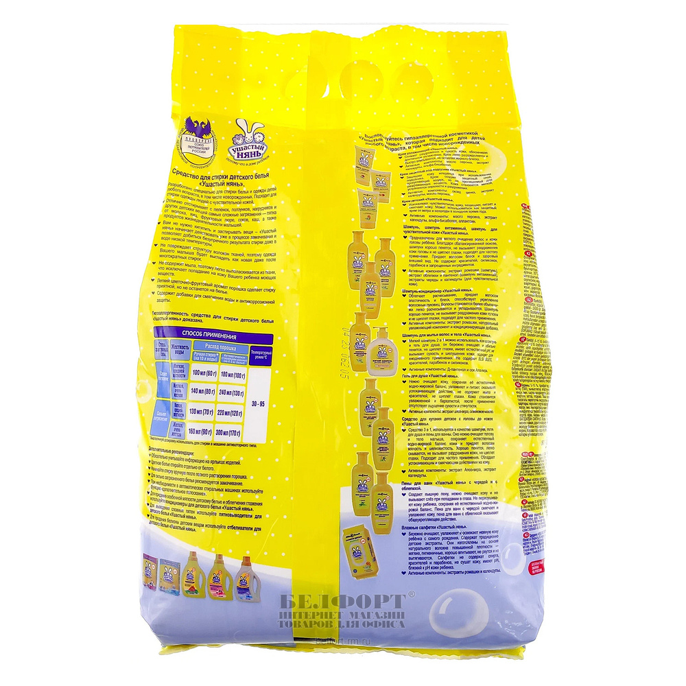 Добавить к сравнению109325Есть в наличии 51 уп.Порошок стиральный Ушастый нянь, "Детский", 400г, для всех типов стирки