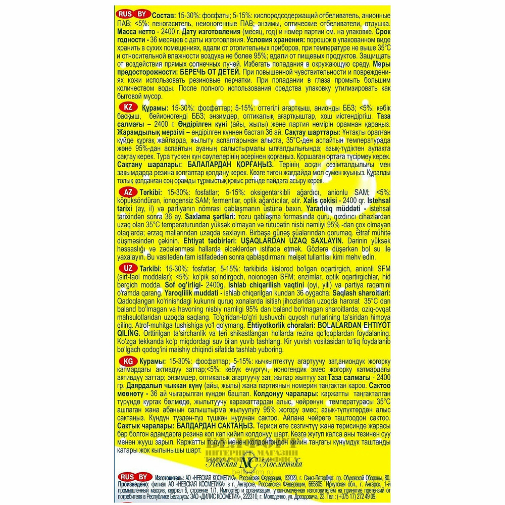 Порошок для стирки белья и одежды детей любого возраста, в том числе и новорожденных. Применяется для стирки вручную и в автоматических стиральных машинах. Эффективно и бережно отстирывает детское белье, не вызывая раздражения кожи и аллергии у детей. Не содержит мыла и поэтому легко выполаскивается из ткани.