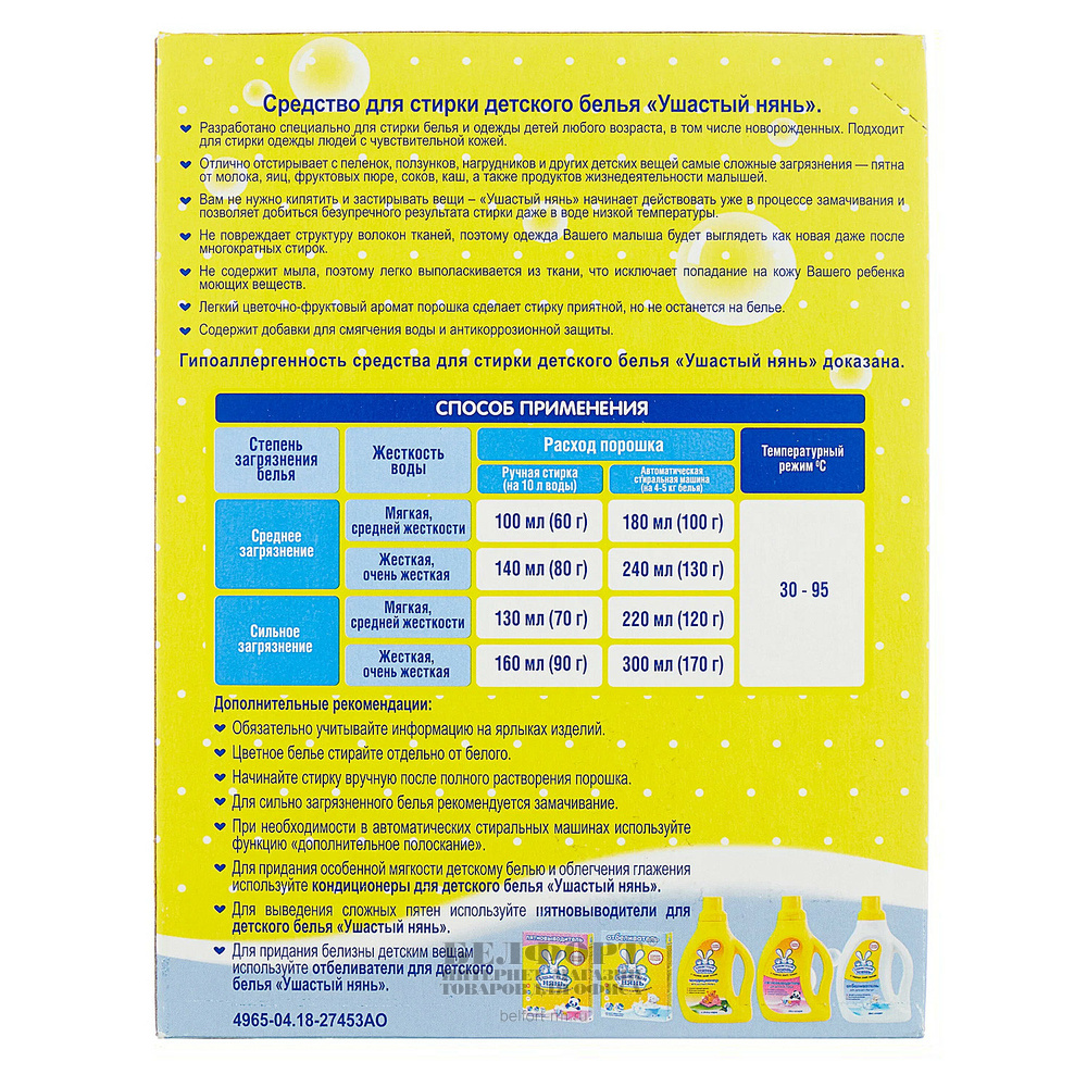 Порошок для стирки белья и одежды детей любого возраста, в том числе и новорожденных. Применяется для стирки вручную и в автоматических стиральных машинах. Эффективно и бережно отстирывает детское белье, не вызывая раздражения кожи и аллергии у детей. Не содержит мыла и поэтому легко выполаскивается из ткани.