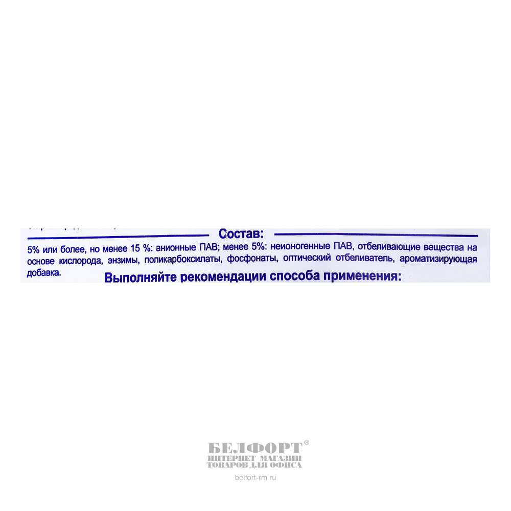 Порошок стиральный синтетический универсальный с пониженным пенообразованием с биодобавками и перекисными солями для замачивания, стирки и отбеливания изделий из хлопчатобумажных, льняных, синтетических тканей, а также тканей из смешанных волокон в стиральных машинах любого типа.