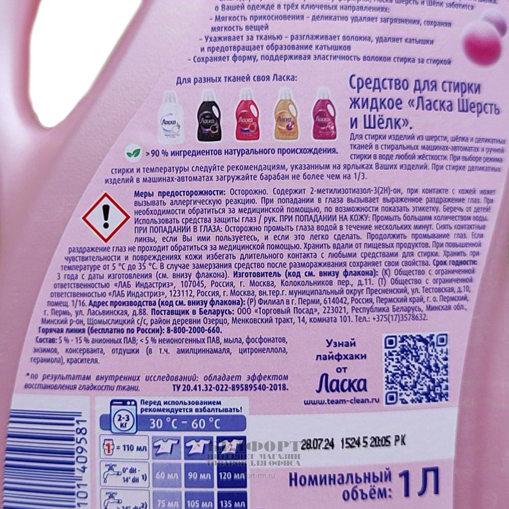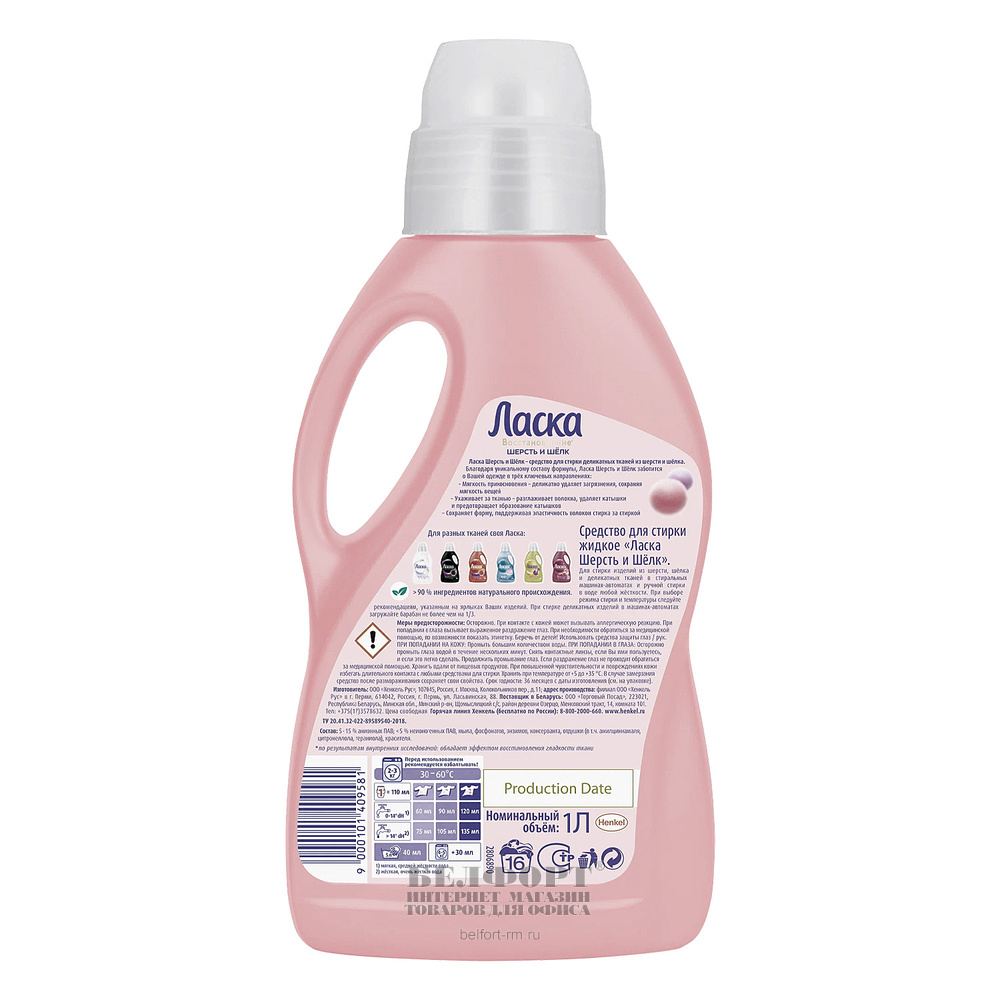 Гель для стирки Ласка, "Шерсть и шелк", для всех типов стирки, 1л