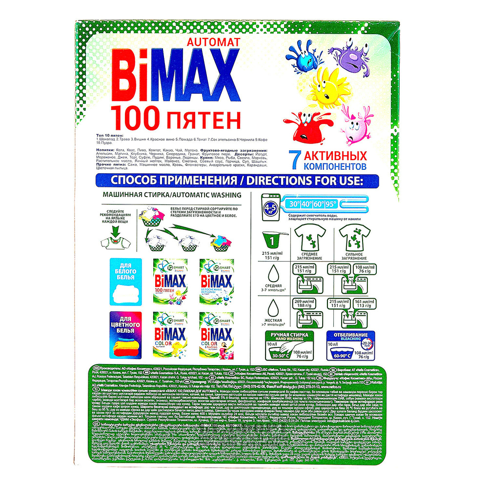 Порошок стиральный BiMAX, "100 пятен", 400г, автомат, картон. уп., для белого и цветного белья