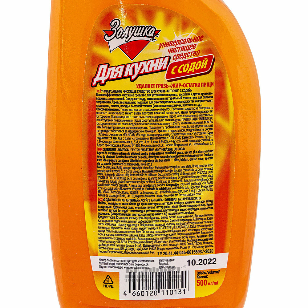 Высокоэффективное чистящее средство для устранения жировых, засохших и других трудновыводимых загрязнений. Содержит мощный натуральный очиститель — соду, быстро и безопасно удаляющую загрязнения. Средство идеально подходит для очистки различных поверхностей на кухне — плит, столешниц, плитки, посуды, бытовой техники (микроволновых печей, вытяжек и т. д.) .