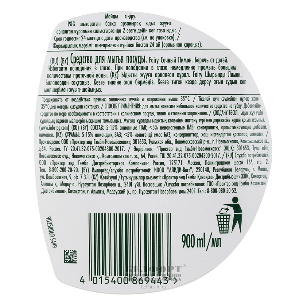 Средство для мытья посуды Fairy, "Сочный лимон", 900мл, флип-топ