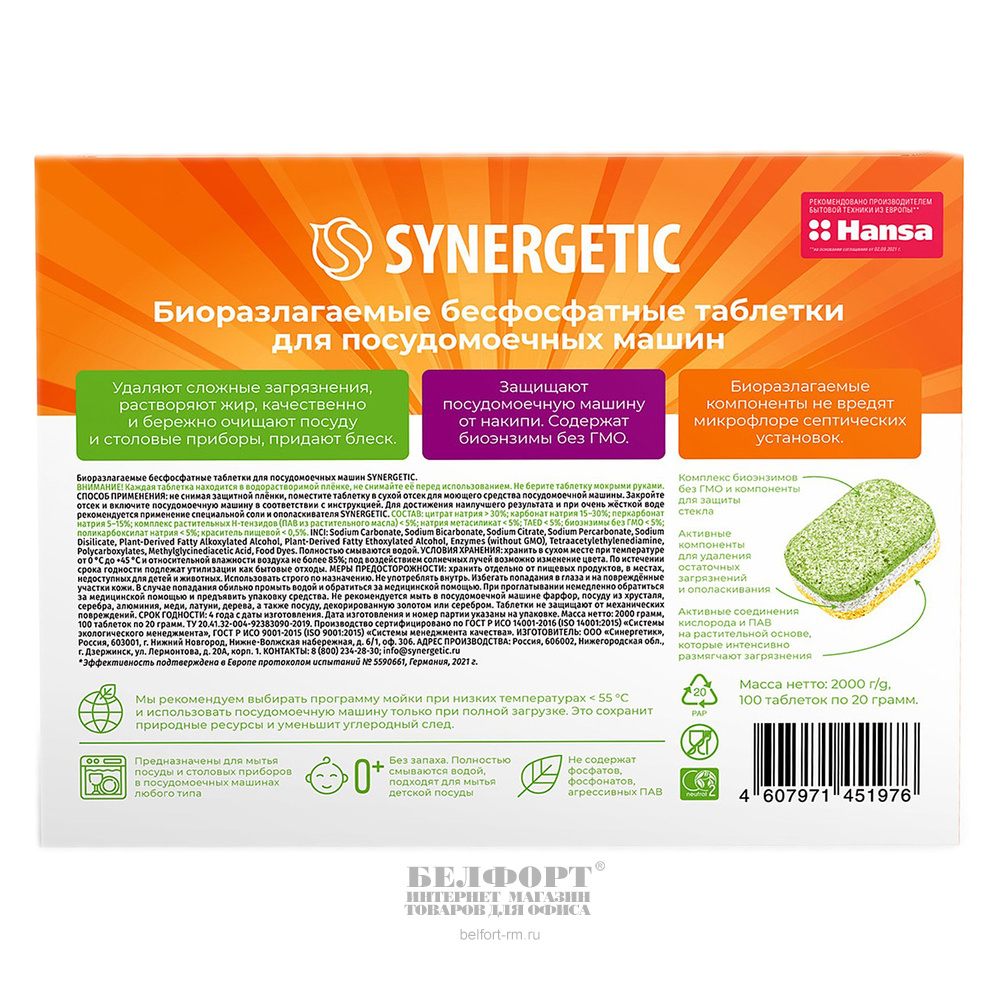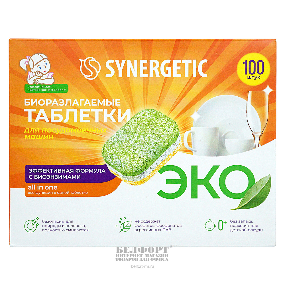 Таблетки 100шт, Synergetic, для посудомоечных машин, бесфосфатные, биоразлагаемые
