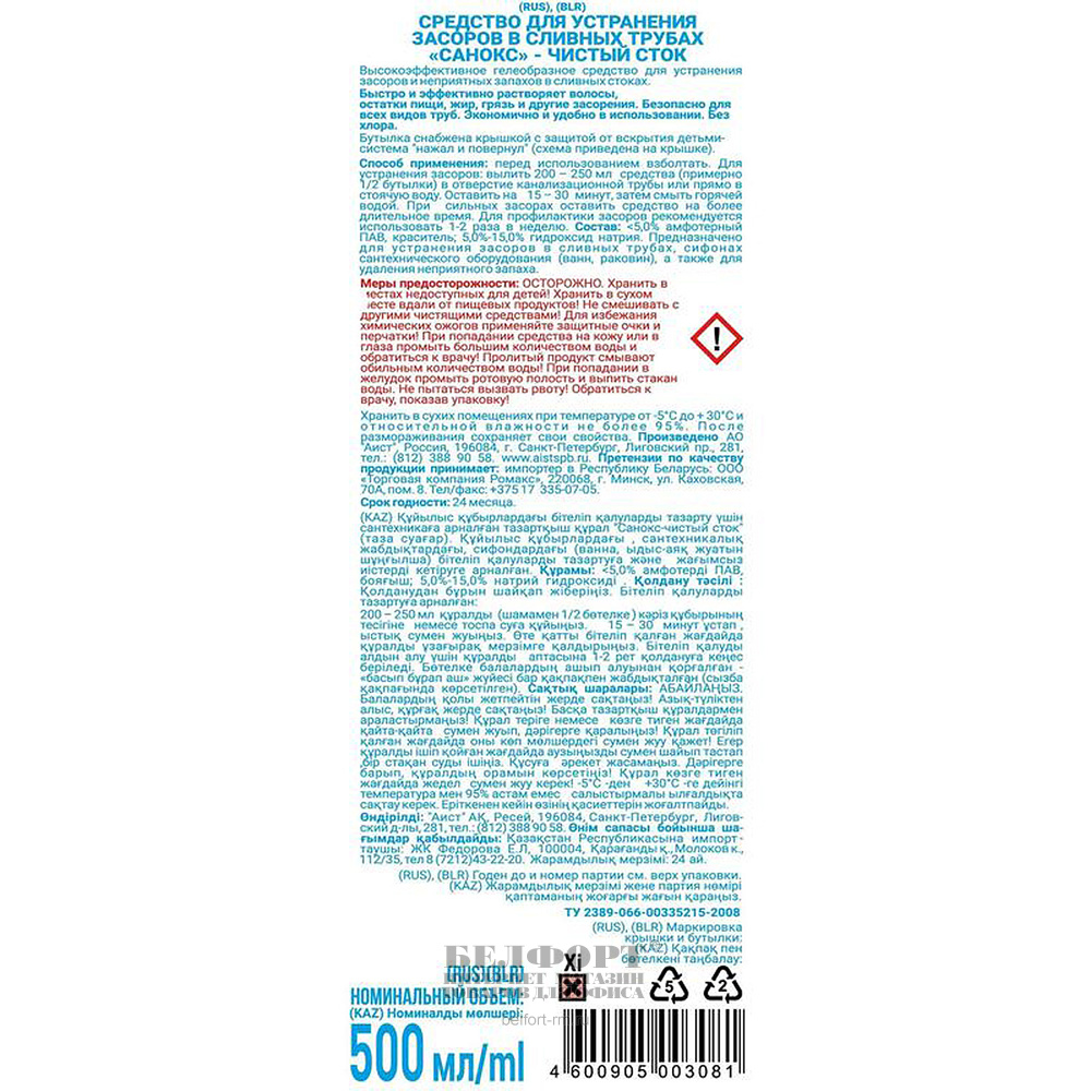 Чистящее средство Санокс, "Чистый сток", 500мл, для устранения засоров, флакон