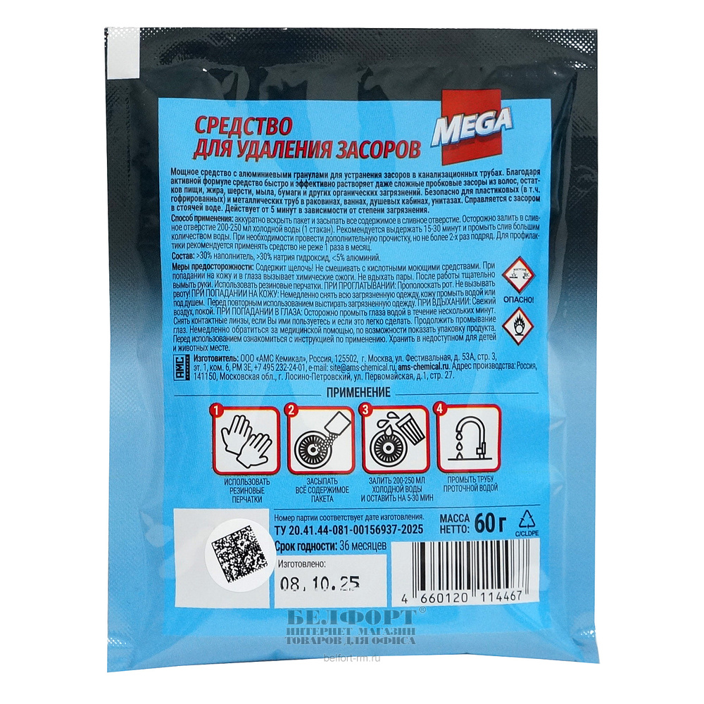 Чистящее средство MEGA, 60г, для устранения засоров, пакет