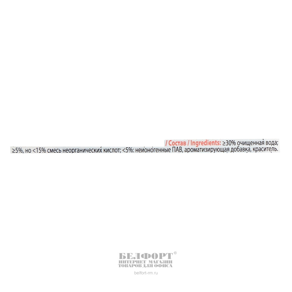 ≥30% очищенная вода; ≥5%, но <15% смесь неорганических кислот; <5%: неионогенные ПАВ, ароматизирующая добавка, краситель.