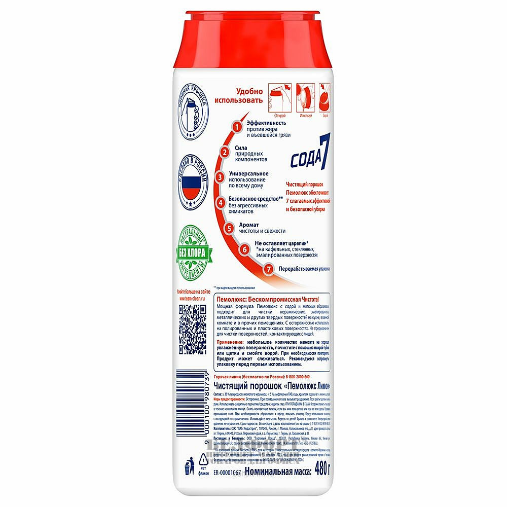 Чистящий порошок универсальный, Пемолюкс, "Сода 7", "Лимон", 480г, пластик. банка, флип-топ, без хлора