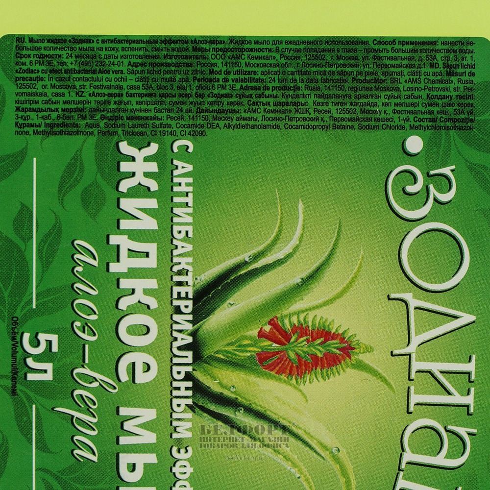 Жидкое мыло 5л, Зодиак, "Антибактериальное", "Алоэ вера", канистра