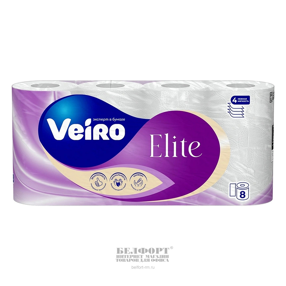 Бумага туалетная 4-слойн., Veiro, "Elite", белая, 15м, 8шт, с втулкой, с тиснением, перфорация есть