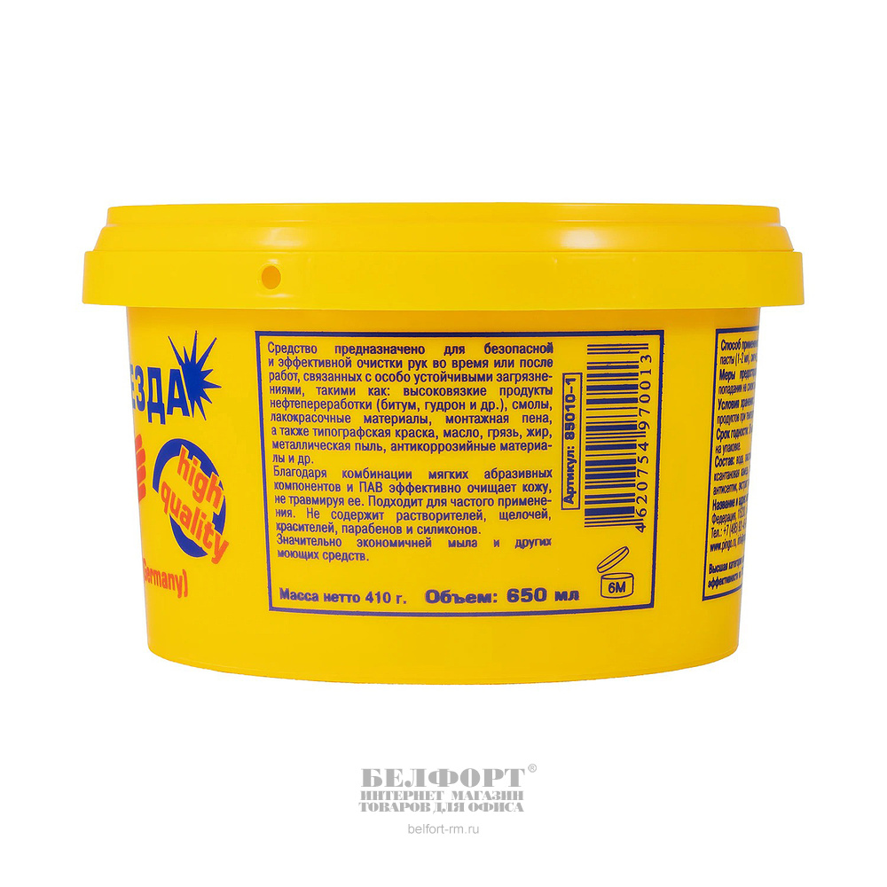Паста "Чистая звезда" используется для эффективной очистки рук, если вы регулярно имеете дело с пачкающими, жирными и въедливыми материалами. Она обладает тройным действием: очищающим, антисептическим, увлажняющим. Абразивные частицы бережно очищают кожу от грязи без раздражения, а поверхностно-активные вещества расщепляют жир. Продукт применяют в автосервисах, на заводах, производствах, подходит она и для ремонтных работ ? на строительных объектах или дома. Паста-очиститель для рук "Чистая звезда" от группы компаний Pingo расфасована в удобные контейнеры по 650 мл — такой объем можно использовать до 4000 раз, что существенно экономичнее расхода мыльных средств. Для полного очищения достаточно всего 2 граммов состава ? столько помещается на фаланге пальца. Распределите его по смоченной коже, потрите несильными движениями и затем смойте. Очищающая паста "Чистая звезда" бережно подходит к мытью рук, поскольку содержит увлажняющие вещества и не вызывает аллергии. Благодаря легкой текстуре (диаметр частиц до 0,1 мм) и биоразлагаемым компонентам она просто смывается, не засоряет канализацию, не вредит окружающей среде. Чистящую пасту для рук "Чистая звезда" с артикулом 85010-1 можно купить, не беспокоясь о цене для здоровья или экологии.