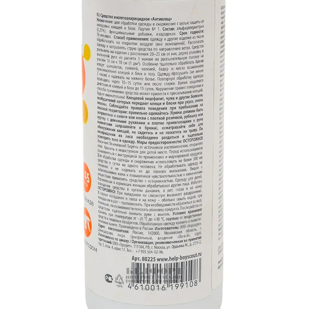 Предназначение: Для защиты людей от иксодовых клещей и блох (переносчиков возбудителей опасных заболеваний человека). Время защитного действия от клещей и блох до 15 суток.
