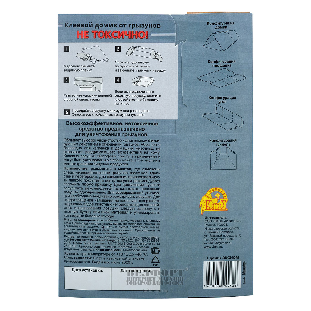 Клеевой домик от грызунов "Котофей" — это надежное и эффективное средство для борьбы с грызунами в домашних условиях. Он сочетает в себе простоту использования и безопасность, что делает его идеальным выбором для тех, кто стремится избавиться от нежелательных посетителей.