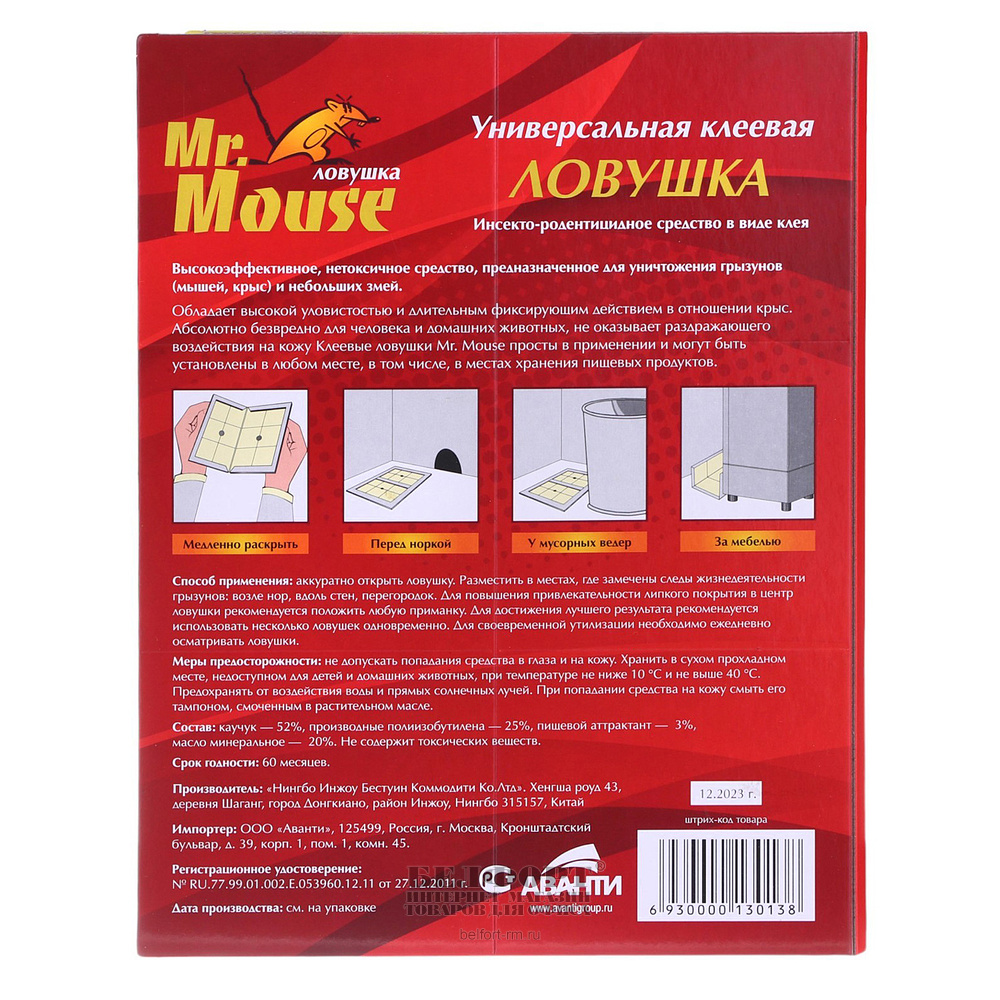 Ловушки Mr. Mouse просты в применении и могут быть установлены где угодно, в том числе и в местах хранения пищевых продуктов. Средство содержит 40 г клея.