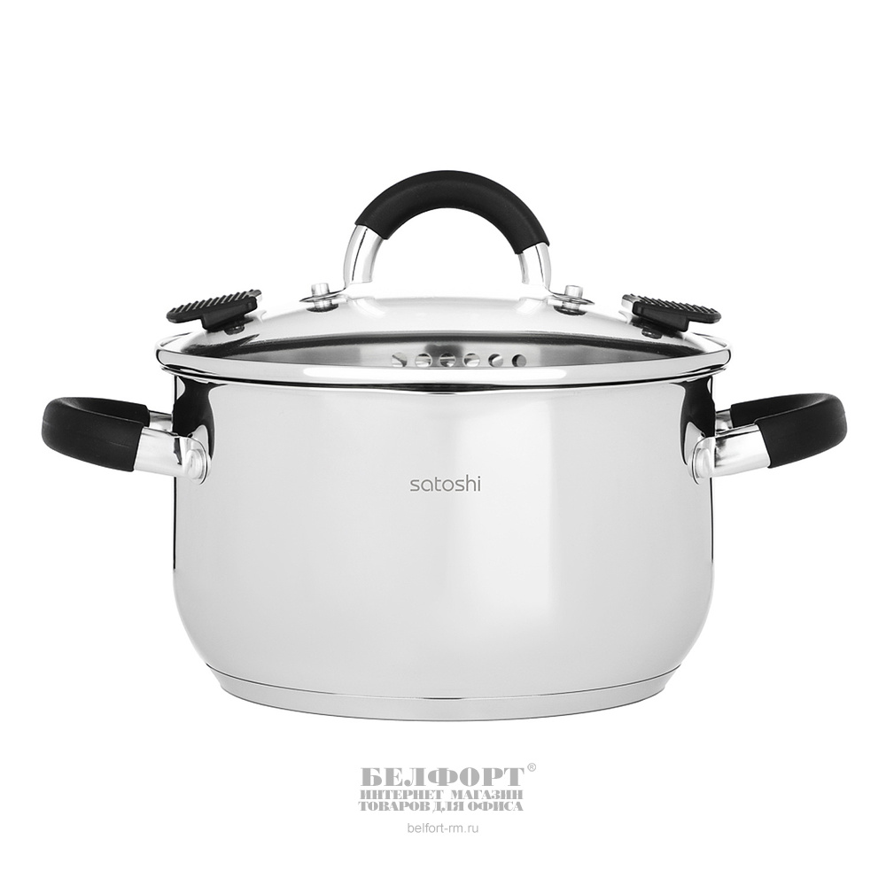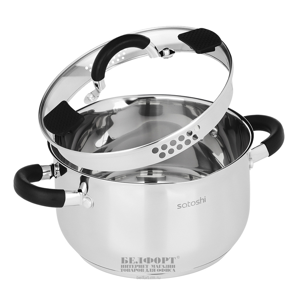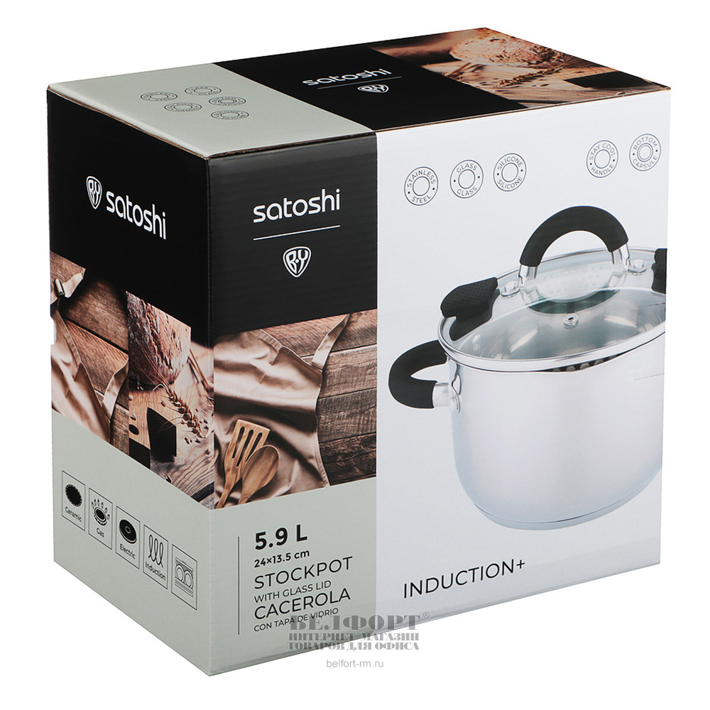 Кастрюля 5,9л, нержавеющая сталь, Satoshi, "Арбон", d 24 см, h 13,5см, со стеклянной крышкой, для всех типов плит, индукционное дно