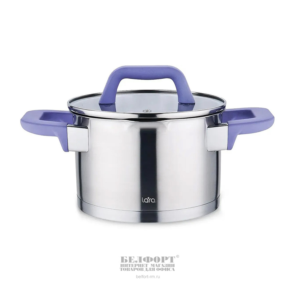 Кастрюля 2л, нержавеющая сталь, Lara, "Лаванда", 16см, со стеклянной крышкой, со сливом, soft touch, для всех типов плит, индукционное дно