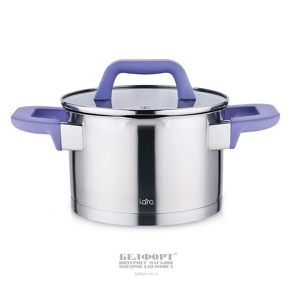 Кастрюля 3,8л, нержавеющая сталь, Lara, "Лаванда", 20см, со стеклянной крышкой, со сливом, soft touch, для всех типов плит, индукционное дно