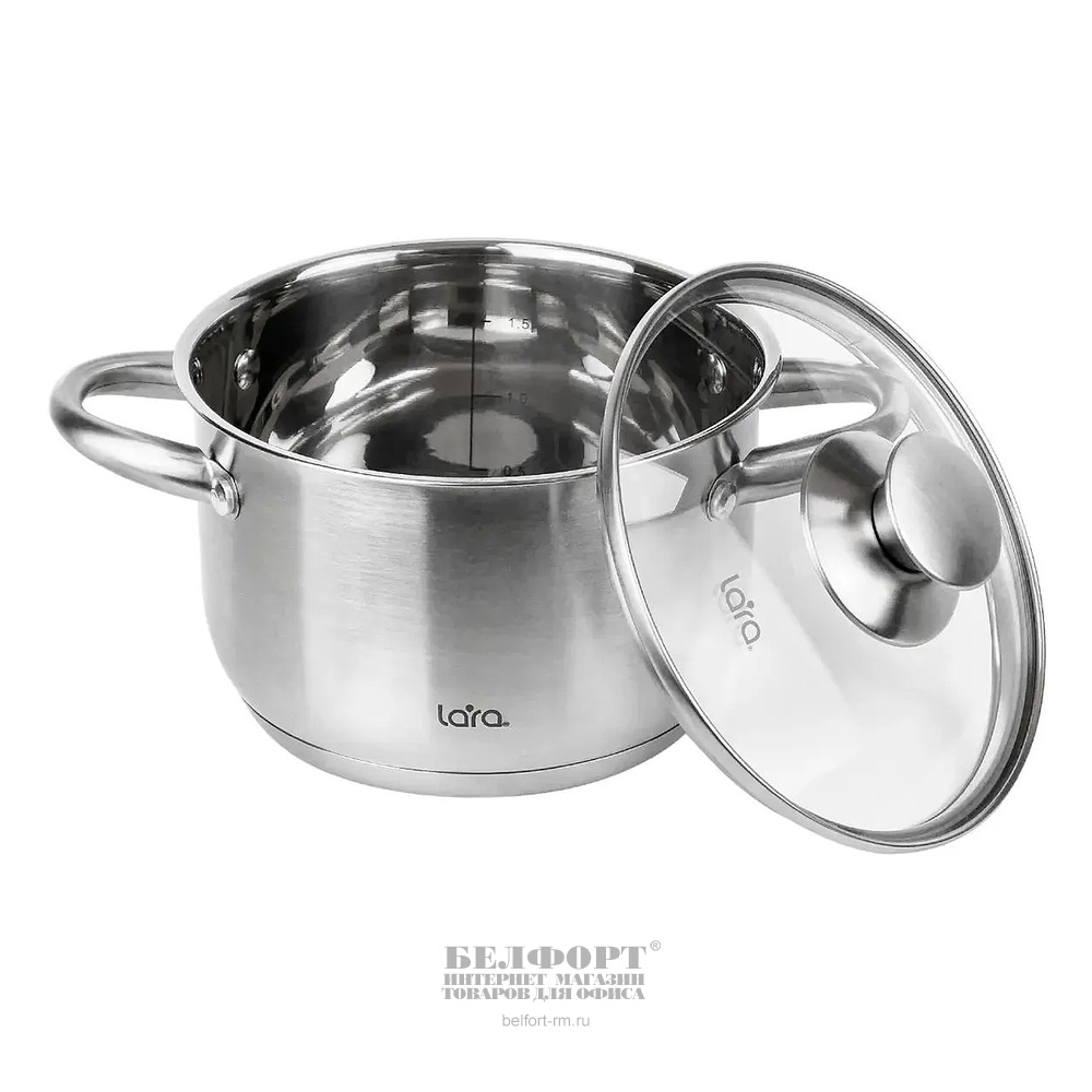Кастрюля 8,2л, нержавеющая сталь, Lara, "Афина", 26см*15,5см, со стеклянной крышкой, для всех типов плит, индукционное дно