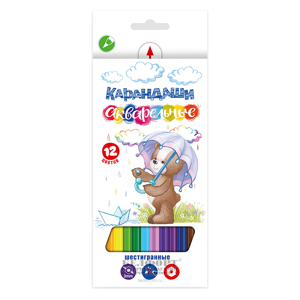 Цветные карандаши 12цв, Kanzy, "Мишка", диаметр грифеля 3мм, шестигранный, акварельный, картон. уп.